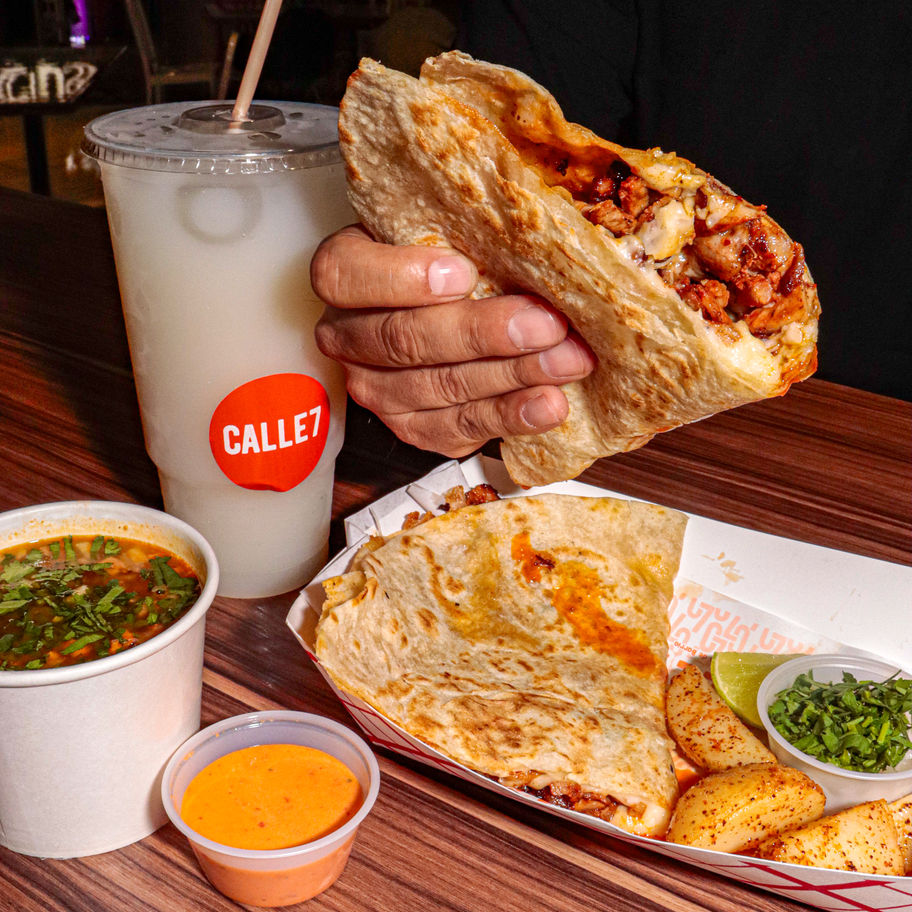 $199: Frijoles a la Charra con Salchicha Asada, Tocino y Chorizo + Gringas al Pastor tortilla de harina y queso asadero + Agua Fresca del Día
